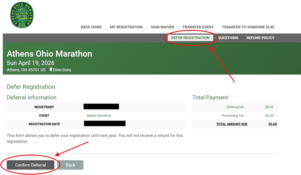 Important: You must go through the “Deferrals” tab to see your credit. If you go directly to the main race website and sign up as a new participant, the system will not know to apply your credit, and you will be charged full price.