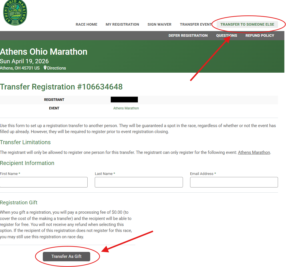 *At this time there is no transfer fee for the Athens Ohio Marathon, and the new participant will pay $0.00 to the race, as it’s considered a “gift” from the original entrant. The two runners part of the transfer can exchange payment if desired.